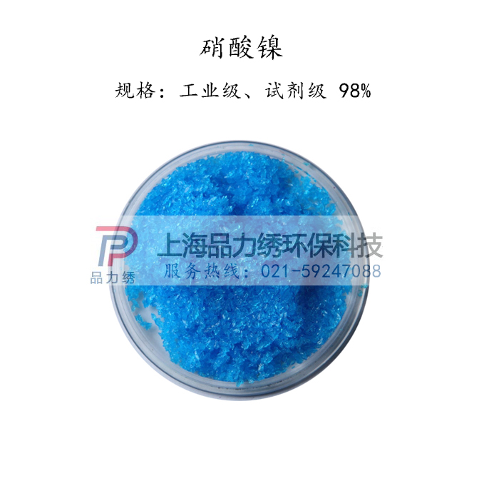 中文名稱:硝酸鎳(六水) 中文別名:六水硝酸鎳 英文名稱:Nickel (II) Nitrate Hexahydrate 分子式:Ni(NO3)2·6H2O 分子量:290.7944 性狀:碧綠色單斜晶系板狀晶體,易溶于水,液氨,乙醇,微溶于丙酮,水溶液呈酸性,有吸濕性,潮濕空氣中很快潮解。 用途:用于鍍鎳,鎳催化劑,制純氧化鋅,陶瓷工業(yè)中作褐色顏料,金屬著色。